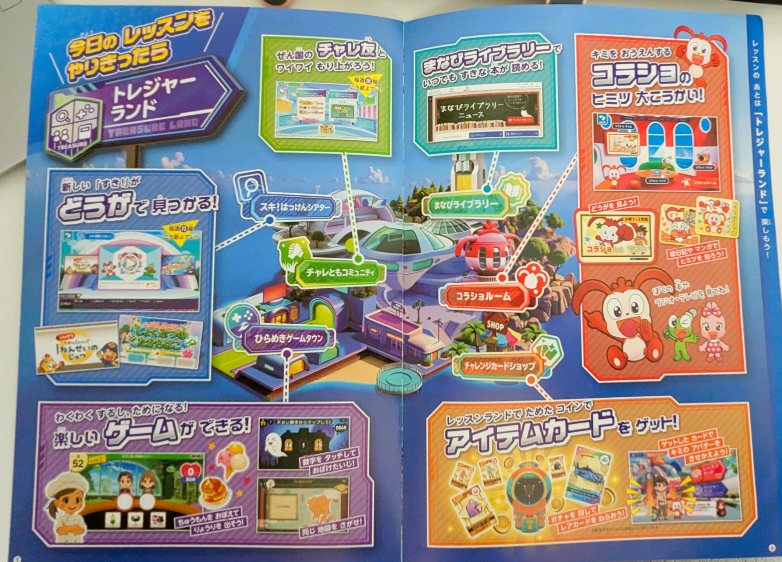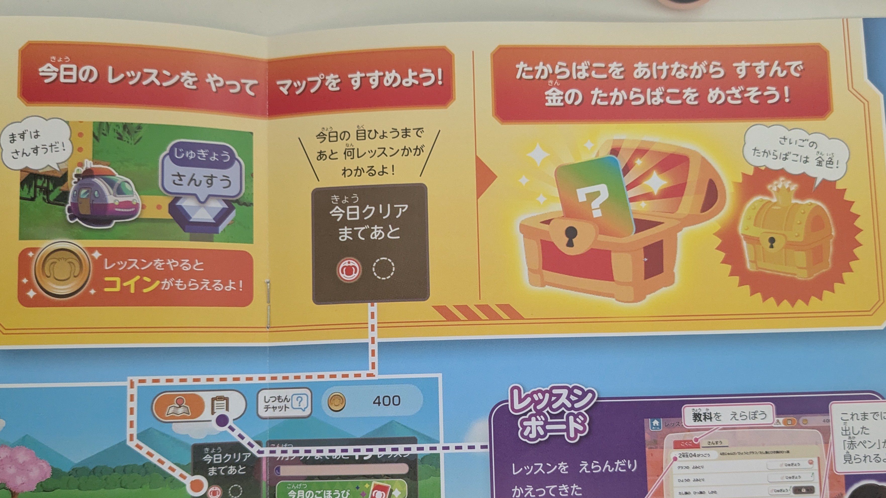 チャレンジタッチでは「レッスンランド」というマップを進みながら学習していきます。毎日のレッスンをこなすとコインがもらえたり宝箱を開けられたりと、ゲーム感覚で進められる仕組みになっています。