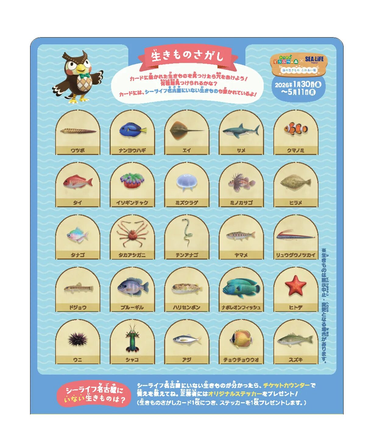 カード内には1種類、水族館にいない生きものが描かれており、正解すると記念ステッカーがもらえます♪